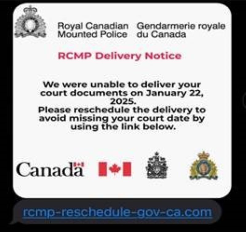 Les 23 et 24 janvier 2025, le Détachement de la GRC de Kamloops et le Détachement rural de Tk’emlúps ont eu plusieurs appels de résidents indiquant qu’ils avaient reçu un message texte de la GRC mentionnant faussement qu’elle n’était pas en mesure de livrer des documents judiciaires. Les victimes étaient alors invitées à cliquer sur un lien pour effectuer une modification de date. Le message comprend le logo de la GRC et du gouvernement du Canada. Nous avons été mis au courant après que plusieurs personnes ont compris qu’il s’agissait d’une escroquerie et nous en ont fait part. Par conséquent, nous menons une enquête.