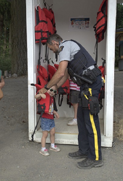 Le gendarme Holditch aide un jeune enfant à enfiler un gilet de sauvetage afin de s’assurer que celui-ci est bien ajusté.