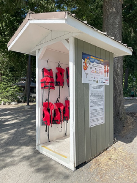 Voir une image agrandie: Poste de prêt de gilets de sauvetage de diverses tailles du programme « Un enfant, ça ne flotte pas ».