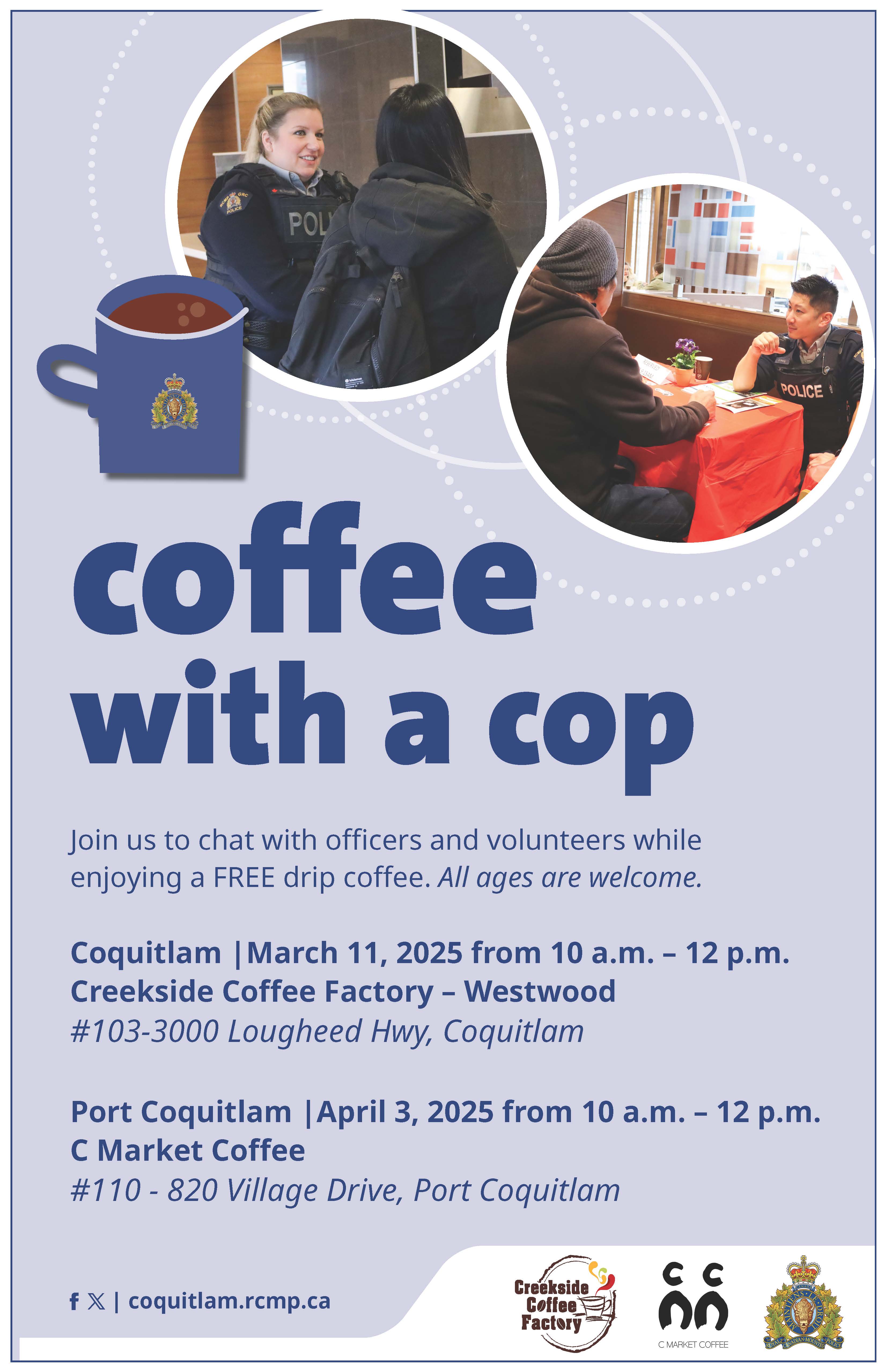 Join Coquitlam RCMP at two upcoming ‘Coffee with a Cop’ events and get to know the officers serving your community.