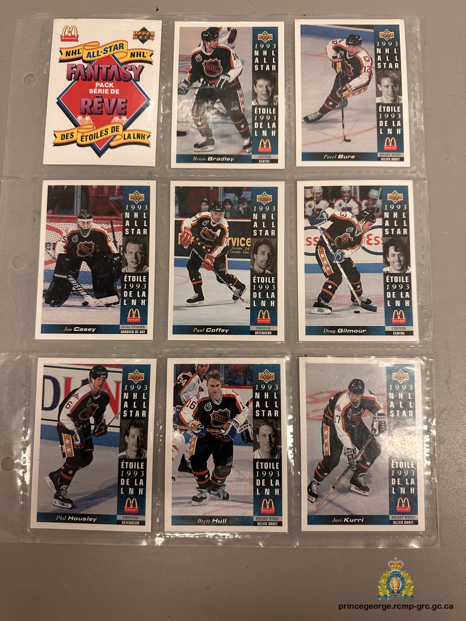 The hockey cards appear to be a set and likely have sentimental value for whomever has lost them. If you believe them to be yours, you can contact an investigator by calling our non-emergency line. You will need to bring proof of ownership, or be able to speak to how you know the cards to be yours, to have them released to you, states Cpl. Jennifer Cooper, Media Relations Officer for the Prince George RCMP.