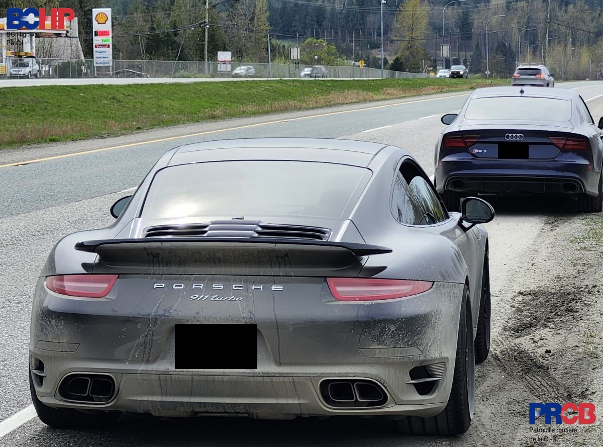 On March 30, 2024, at 3:00pm, BC Highway Patrol – Chilliwack impounded a blue Audi and a rented black Porsche for travelling at speeds over double the speed limit on Highway 1 near Popkum Road. Officers clocked the vehicles at just over 200 km/hr in the 100 km/hr zone. Both drivers received violation tickets for excessive speed and both were left without their impounded vehicles for seven days.