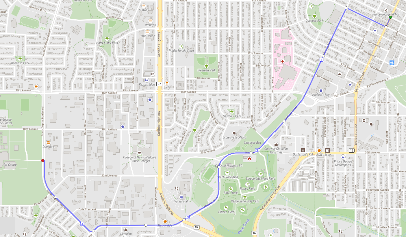 The route for this year sees us starting at the Prince George RCMP Detachment on Fifth Avenue and Victoria Street at 10:30 a.m. We will stop on Victoria Street in front of RBC for a photo op, then head westbound on Sixth Avenue until Winnipeg Street. From there, the runners will follow Winnipeg Street as it turns into Massey Drive. When we hit Ospika Boulevard we will turn north until we get to CN Centre, which is the end point for this year’s event, and where the BBQ will be taking place! We anticipate arriving at CN Centre around 12:00 p.m.