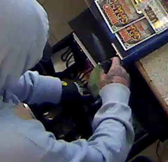 Video captured by a surveillance camera shows the suspect entering the store through the main doors. He approaches the food aisles. When a clerk comes out of the back room to go into the main hall, the suspect rushes towards the cash register and threatens the clerk with a knife. The clerk opens the cash drawer and the suspect removes a number of bills. The suspect then turns back to leave the store.