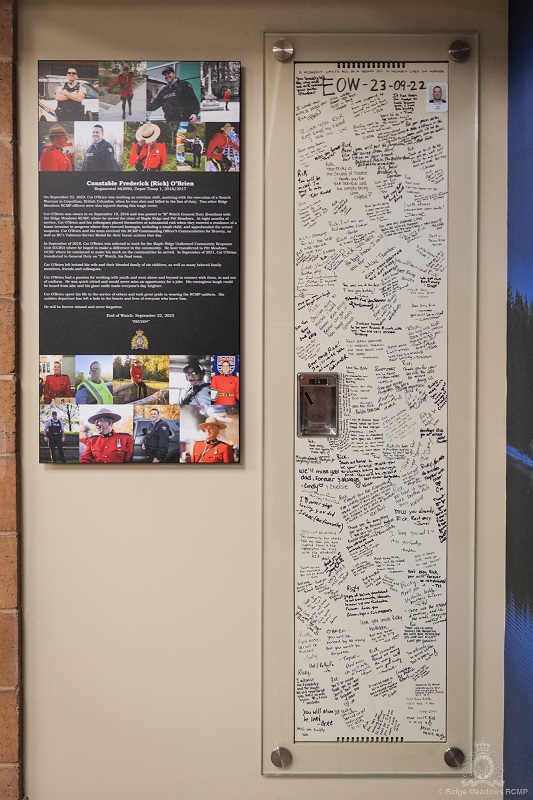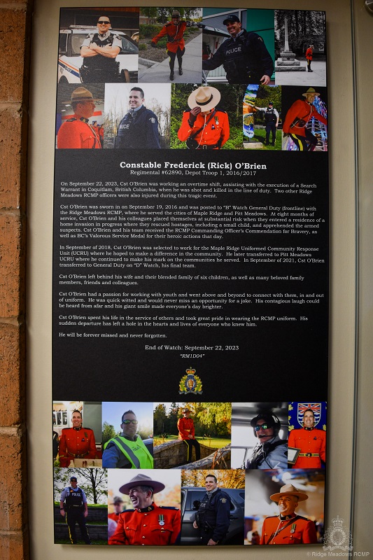 On September 20, 2024, the Ridge Meadows RCMP held a private ceremony to unveil a Cenotaph and a Wall of Honour to commemorate Constable O’Brien’s legacy of bravery and compassion.